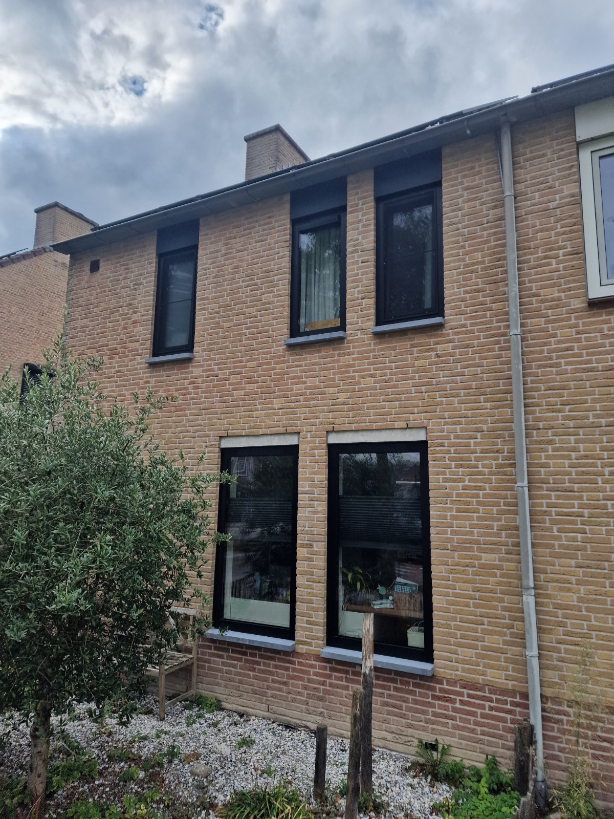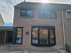 Bij onze klant in Tilburg hebben we alle ramen vervangen door nieuwe aluminium kozijnen in zwarte kleur, uitgerust met een hoogwaardig driedubbel glas pakket. Daarnaast hebben we alle buitenvensterbanken vernieuwd en uitgevoerd in natuursteen. We hebben tevens rolluiken in dezelfde kleur gemonteerd, samen met de bijbehorende buitenafwerkingen. Het geheel zorgt voor een moderne en duurzame uitstraling van de woning.